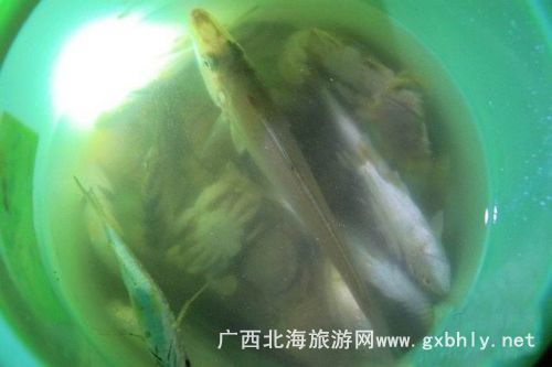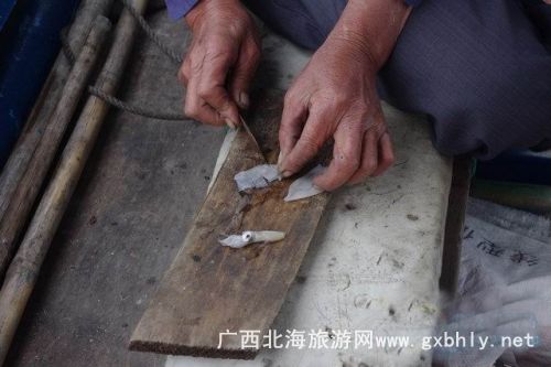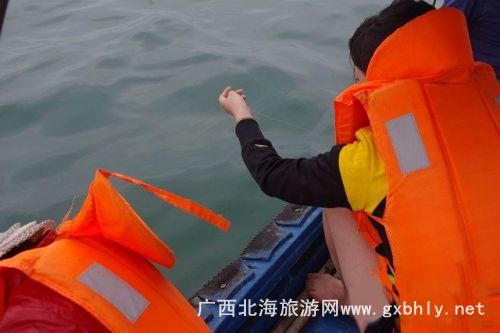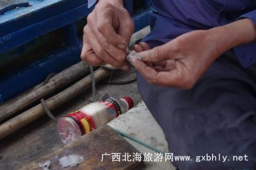 在等著魚兒撞網(wǎng)的一個(gè)小時(shí)里,我們?cè)诖笫宓闹笇?dǎo)下開始了釣魚。先是用小刀將提前準(zhǔn)備好的魷魚,切成小塊當(dāng)誘餌,我們的釣魚工具很特殊,一個(gè)罐瓶子卷著釣線,漁夫告訴我們,在深海釣魚用這種辦法比較好釣,又很有手感,當(dāng)?shù)氐臐O民出海釣魚都是這樣釣的。就這樣,我們的帥哥美女們就開始認(rèn)真的釣了起來,因?yàn)楸容^生疏,就漁夫釣了幾條石頭魚。