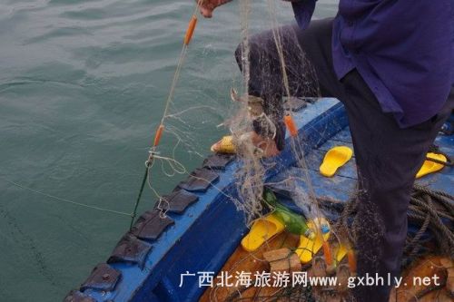 我們就這樣釣著,美女們感覺不好釣就放下釣線,哼著小調(diào)又唱起那,陽(yáng)光、沙灘、仙人掌。。。。緊張的時(shí)刻到了,漁夫說到時(shí)間去收網(wǎng)了,我們就趕緊收起釣線坐好,船又開始駛向浮標(biāo)的地方。
