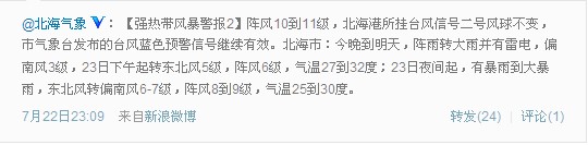 北海氣象局也發(fā)布了最新的強(qiáng)熱帶風(fēng)暴警報: