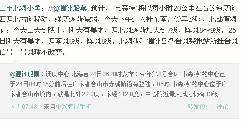 22日19時30分廣西氣象臺發(fā)布臺風(fēng)黃色預(yù)警:今年第8號熱帶風(fēng)暴“韋森特”已于今天下午加強(qiáng)為強(qiáng)熱帶風(fēng)暴,18時其中心仍位于廣東省湛江市東偏南方約530公里的南海北部海面上,即北緯19.3度,東經(jīng)115.0度,中心附近最大風(fēng)力10級(25米/秒),最低氣壓983百帕。預(yù)計(jì)“韋森特”22日夜間繼續(xù)在原地回旋少動,以后將以每小時10公里左右的速度向西北方向移動,逐漸向廣東西部到海南東部沿?拷,強(qiáng)度逐漸加強(qiáng),并將于23日晚上到24日上午在廣東陽江到海南陵水一帶沿海登陸。受其影響,今天晚上到明天白天,梧州、玉林、貴港、北海、欽州、防城港等市有中雨,局部大雨到暴雨,我區(qū)其它地區(qū)多云有分散陣雨或雷雨。23日晚上到25日,桂南的部分地區(qū)有大雨到暴雨,局部大暴雨到特大暴雨,我區(qū)其它地區(qū)有小到中雨,局部大雨到暴雨;沿海地區(qū)有6級,陣風(fēng)8級的大風(fēng)。北部灣海面:今晚到明天,中到大雨,偏南風(fēng)轉(zhuǎn)東北風(fēng),風(fēng)力逐漸加大到5〜6級,陣風(fēng)7級;23日晚上到25日有暴雨,旋轉(zhuǎn)風(fēng)9〜10級,陣風(fēng)11級。