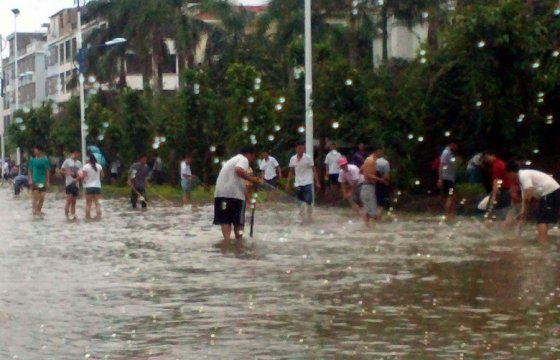 受“蘇拉”殘余云系影響,連日北海普降暴雨、大暴雨。市區(qū)部分路段出現(xiàn)積水內(nèi)澇現(xiàn)象,其中上海路、西南大道等路段積水明,顯而積水路段拉起了警戒線。而其中湖北路附近的居民卻在積水路段上拉網(wǎng)抓魚。