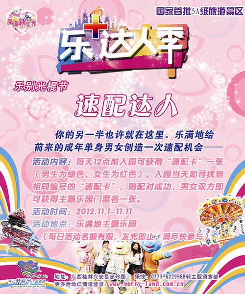 據(jù)報(bào)道,樂滿地樂別光棍節(jié)活動(dòng)將于11月1日開始,持續(xù)11天至光棍節(jié)結(jié)束。活動(dòng)期間,凡年滿29歲以上的大齡單身男女相約兩人同行游玩主題樂園,更可享受一人購(gòu)票一人免票入園的特惠,除此之外,參與速配達(dá)人活動(dòng),入園即可隨機(jī)領(lǐng)取速配卡,若能在園中找到配對(duì)的“單身卡”即速配成功,獲得驚喜禮品,讓大家除了享受主題樂園幾十項(xiàng)大型游樂設(shè)施的動(dòng)感刺激之余,快樂的告別來年光棍節(jié)。
