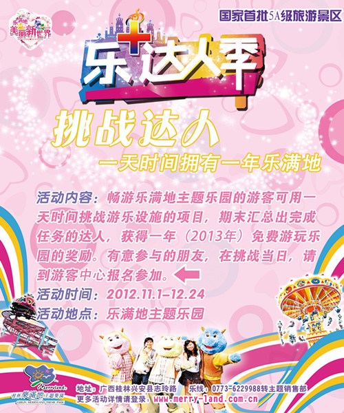 另外,11月1日開始,朋友們來樂滿地不僅可以瞬間脫“光”,還有能一天變達(dá)人的活動(dòng),2012年樂滿地“挑戰(zhàn)達(dá)人”同時(shí)開啟帷幕,精彩的主題樂園達(dá)人、高爾夫達(dá)人現(xiàn)場(chǎng)即可報(bào)名參與,只要完成主題樂園指定的設(shè)施或打破高爾夫俱樂部當(dāng)日最多洞數(shù)記錄,即可領(lǐng)取大獎(jiǎng),樂滿地恭候各方達(dá)人前來來挑戰(zhàn),展示自己的歡樂與潛能,成為達(dá)人的朋友即可用一天時(shí)間可擁有一整年樂滿地哦!