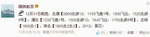 由于海面風(fēng)力減弱,北海船務(wù)公司今天早上發(fā)布復(fù)航通知,北海潿洲島航線全線開通,今天航班安排如下: