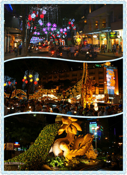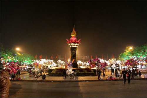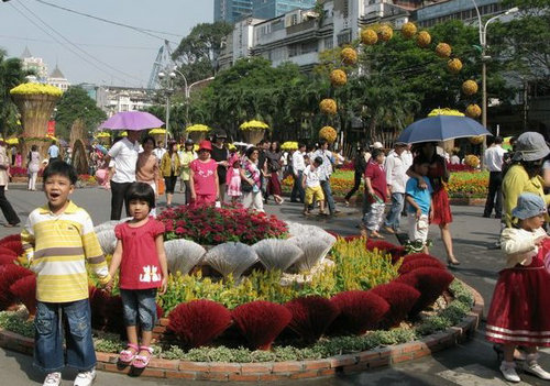 花市是越南春節(jié)重要活動(dòng)之一。比如河內(nèi),春節(jié)前約10天,花市就開(kāi)始熱鬧。越南人最?lèi)?ài)的年花有劍蘭、大麗菊、金桔和桃花。除了鮮花、盆景,花市還出售各式氣球、彩燈、玩具、年畫(huà)、春聯(lián)、年歷等,把相連的幾條街道裝點(diǎn)得五彩繽紛,喜氣洋洋。