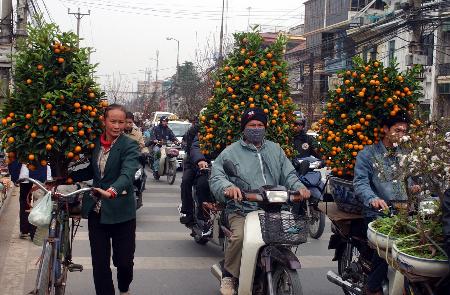 在越南首都河內(nèi)街頭,幾名居民拉著從花市買(mǎi)回的柑桔樹(shù)回家。與中國(guó)一樣,春節(jié)是越南最隆重的傳統(tǒng)節(jié)日,家家戶(hù)戶(hù)都會(huì)在節(jié)前準(zhǔn)備各種年貨。