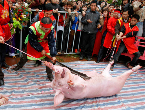 另外,越南不少少數(shù)民族地區(qū)還有不同的慶典儀式,最特別就屬虐殺活豬祭祀了,在越南北寧省Nem Thuong村,當(dāng)?shù)卮迕裨谡鲁趿@天舉行儀式,紀(jì)念13世紀(jì)反抗皇權(quán)的將軍Doan Thuong,Doan Thuong也被當(dāng)作該村的守護(hù)神。