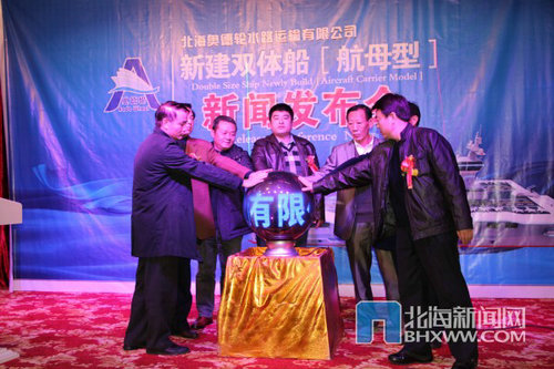 據(jù)北海新聞網(wǎng)的消息,2013年1月8日,北海奧德倫水路運輸有限公司召開的“新建雙體船【航母型】新聞發(fā)布會”上獲悉,北海奧德倫水路運輸有限公司將委托青島歐世達船舶工程有限公司建造一艘46米的雙體型航母客船,用于北海海上觀光旅游項目。