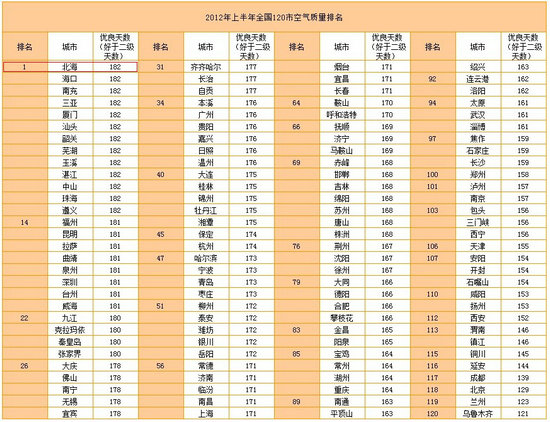 2012年全國空氣質(zhì)量榜 北海榮登第一