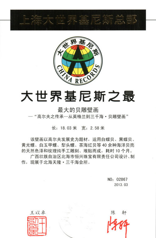 據(jù)報道,近日,由北海市恒興珠寶有限責任公司設計、制作的“高爾夫之傳承—從英格蘭到三千!へ惖癖诋嫛鄙陥蟆按笫澜缁崴怪睿ㄖ袊睿鲍@得上海大世界基尼斯總部確認。