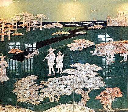 該壁畫長18.03米,寬2.58米。以高爾夫發(fā)展史為題材,運用白蝶貝、黑蝶貝、黃光螺、白玉甲螺、犁頭螺、茶海紅貝等40余種海洋貝殼的天然色澤和紋理純手工雕刻、堆貼而成。
