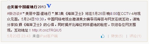 5月10日,2013年《美麗中國(guó)·濕地行》大型公益活動(dòng)在北京啟動(dòng),中央電視臺(tái)臺(tái)長(zhǎng)胡占凡、國(guó)家林業(yè)局局長(zhǎng)趙樹(shù)叢及活動(dòng)形象大使宋祖英等出席。央視派出團(tuán)隊(duì)分赴全國(guó)重要濕地,進(jìn)行為期半年的拍攝,將制作播出50集大型系列片《走遍中國(guó)·濕地行》,從中評(píng)選出最美的十大濕地,制作10集紀(jì)錄片《魅力濕地》,并將于今年10月份舉行大型晚會(huì),公布十大魅力濕地名單。