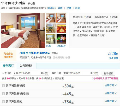 隨著暑期的逼近,越來越多客人希望通過我社預(yù)訂近期酒店。但是,據(jù)北海環(huán)球旅行社王經(jīng)理反映,今天上午幫客人找了好幾家6月22號銀灘附近的三星酒店都沒有房了,令人驚訝的是今年的旅游旺季來得特別早,不得不提醒各位游客朋友預(yù)訂酒店一定要提早,特別是遇到周末高峰期!