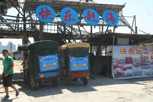 為了解決這個(gè)危及游客生命的頑疾,7月1日上午,北海市旅游整規(guī)辦組織旅游、工商、公安、海事等執(zhí)法部門,以迅雷不及掩耳之勢(shì),搗毀了位于大礅海和金海灣紅樹林附近的以“歡樂趕!睘槊3個(gè)非法“趕海”窩點(diǎn),并現(xiàn)場(chǎng)拆除了“趕!闭信坪托麄鲌D畫一批。