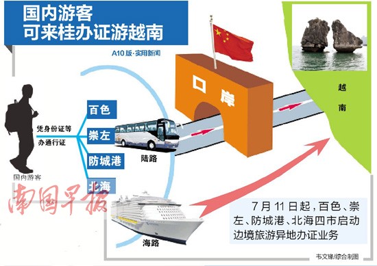 南國早報(bào)記者昨日獲悉,7月11日,受國務(wù)院委托,公安部和國家旅游局聯(lián)合發(fā)文,批準(zhǔn)廣西北海、防城港、百色及崇左市公安機(jī)關(guān)出入境管理部門,為參加邊境旅游的非邊境地區(qū)人員,簽發(fā)邊境旅游出入境證件。今后,來自全國各地的游客,均可參加有權(quán)經(jīng)營邊境旅游業(yè)務(wù)的組團(tuán)社,在我區(qū)這四市的公安機(jī)關(guān)出入境管理部門,辦理中華人民共和國出入境通行證,赴越南旅游
