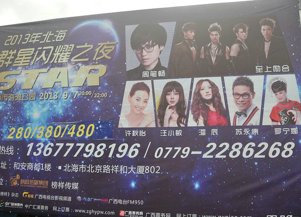 據(jù)悉,作為珍珠節(jié)活動的一部分,2013年9月7日,2013年北海群星閃耀之夜,將在廣西北海市海灘公園激情唱響!本次群星閃耀之夜邀請眾多兩岸明星。周筆暢、蘇永康、潘辰、至上勵(lì)合、汪小敏、許秋怡、羅寧娜等眾多兩岸明星強(qiáng)勢加盟本次群星閃耀之夜。本土歌手楊歷川、陳亮,Miya組合以及PNC樂隊(duì)帶來的原創(chuàng)音樂,為觀眾們帶來聽覺上的全新體驗(yàn)。