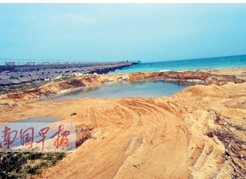 一位島民帶記者來(lái)到公山村小避風(fēng)港附近的海灘,眼前的一幕讓人心寒:原來(lái)美麗平坦的海灘已經(jīng)被盜砂者挖掘得到處是坑。