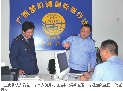 11月19日下午,市旅游整規(guī)辦組織旅游、工商、公安等部門聯(lián)合執(zhí)法,對位于上海路香檳郡一樓的子虛烏有的“廣西夢幻灣國際旅行社”和位于站前路國際新城一樓,擅自打著未經(jīng)允許、假冒他人之名的“廣西商務(wù)國際旅行社國際新城營業(yè)部”進行了突擊查處。