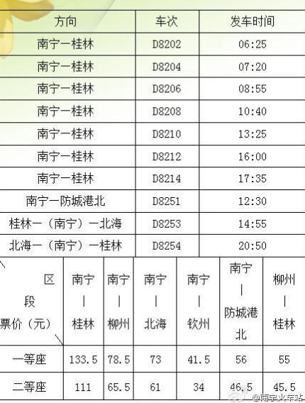 據(jù)了解,廣西今年底將開(kāi)行動(dòng)車(chē)組列車(chē)12對(duì)。其中,12月28日起開(kāi)行桂林~北京西動(dòng)車(chē)組列車(chē)1對(duì),桂林~長(zhǎng)沙南動(dòng)車(chē)組列車(chē)2對(duì)。12月30日起開(kāi)行南寧~桂林動(dòng)車(chē)組列車(chē)7對(duì),南寧~防城港北動(dòng)車(chē)組列車(chē)1對(duì),桂林~北海動(dòng)車(chē)組列車(chē)1對(duì)。具體票價(jià)為:桂林至北京西動(dòng)車(chē)商務(wù)座2530元、一等座1249.5元、二等座806元;桂林至長(zhǎng)沙南動(dòng)車(chē)商務(wù)座557元、一等座250元、二等座181.5元;南寧至柳州動(dòng)車(chē)一等座為78.5元、二等座65.5元;南寧至桂林動(dòng)車(chē)一等座133.5元、二等座111元;南寧至欽州動(dòng)車(chē)一等座41.5元、二等座34元;南寧至防城北動(dòng)車(chē)一等座56元、二等座46.5元;柳州至桂林動(dòng)車(chē)一等座55元、二等座45.5元。