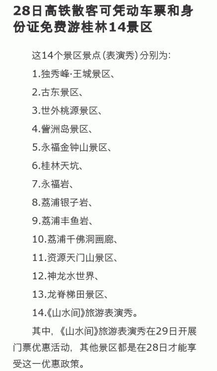 另外,值得注意的是高鐵開(kāi)通在即,旅游部門(mén)紛紛啟動(dòng)『高鐵營(yíng)銷(xiāo)』模式。12月28日零時(shí)至24時(shí),搭乘高鐵動(dòng)車(chē)來(lái)桂林的散客都可在28日當(dāng)天,憑本人動(dòng)車(chē)票和身份證,在桂林14個(gè)景區(qū)景點(diǎn)(表演秀)享受門(mén)票免費(fèi)的優(yōu)惠政策。