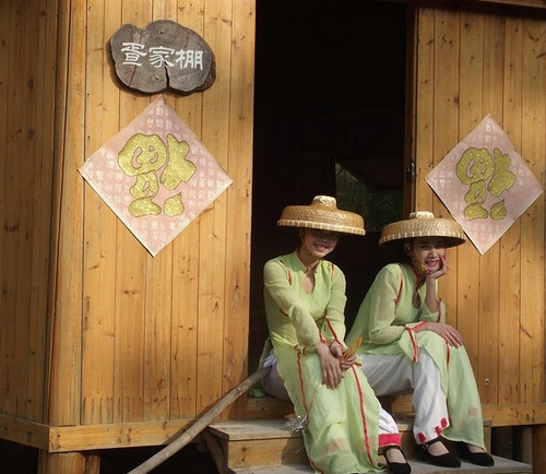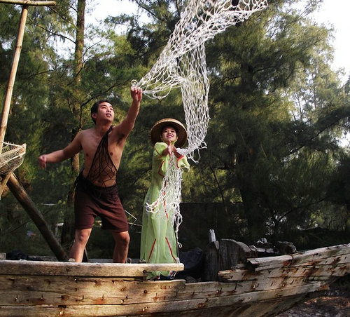 在疍家婚禮巡演中,由“男方家”沿著指定路線前往“女方家”疍家棚,接著“坐艇”前往“拜堂”,期間有美妙的疍家民謠、咸水歌表演。在長(zhǎng)廊門(mén)口的疍家迎賓女,身穿疍家服飾迎接嘉賓、游客等參觀疍家風(fēng)情長(zhǎng)廊并講解。最后是疍家女民兵巡演及歡樂(lè)體驗(yàn)拉大網(wǎng)捕魚(yú)活動(dòng)。