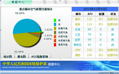 北海與三亞空氣質(zhì)量級別均為II級,狀況為良。廣西的其他兩個城市柳州、桂林也在環(huán)保部監(jiān)控的74個城市范圍內(nèi)。北海、桂林、柳州三個城市12月份空氣質(zhì)量狀況:北海2天優(yōu),26天良,2天輕微污染。