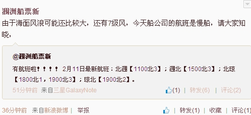 北海船務公司今天上午發(fā)布11日航班消息,目前暫時計劃一班往返潿洲島的船,被困在島上的朋友可以回市區(qū)了,準備上島過夜的朋友要謹慎,按照天氣預報后天風力會增大能不能正常通航還不好說。