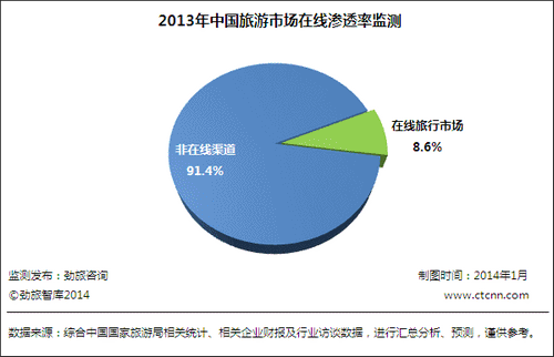2013年,中國旅游市場總交易額約為29475億元,其中在線渠道交易額約為2522億元,中國旅游市場在線滲透率為8.6%。