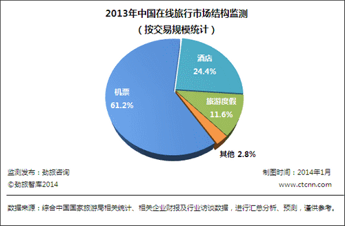 2013年,中國在線旅游市場總交易額約為2522億元,其中,在線機票業(yè)務(wù)總交易額約為1544.6億元,在在線旅游市場中占比為61.2%;在線酒店業(yè)務(wù)總交易額約為614.6億元,在在線旅游市場中占比為24.4%,在線旅游度假業(yè)務(wù)總交易額約為293億元,在在線旅游市場中占比為11.6%。