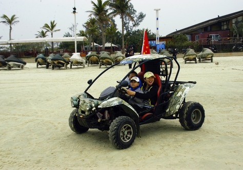 出了漂亮的新太陽(yáng)傘,還有刺激有趣的沙灘車(chē)頗受游客歡迎,一名女游客帶著小朋友駕駛沙灘車(chē)在潔白的沙灘上開(kāi)心娛樂(lè),北海旅行社提醒游客朋友游玩時(shí)一定要注意安全喲。