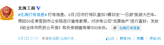 (北海旅行社訊)據(jù)北海工商部門的官方微博發(fā)布的北海打傳信息:6月2日北海市打傳隊查扣1輛非法“一日游”旅游大巴車,帶回50多名乘客到市公安局進(jìn)行宣傳教育,對涉?zhèn)鞴尽褒堅吹禺a(chǎn)”進(jìn)行查封,發(fā)放《致全體市民的公開信》和反傳銷宣傳單900余份。