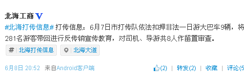 另外,來自北海工商官方的最新消息,6月7日市打傳隊(duì)依法扣押非法一日游大巴車9輛,將281名游客帶回進(jìn)行反傳銷宣傳教育,對(duì)司機(jī)、導(dǎo)游共8人作留置審查。