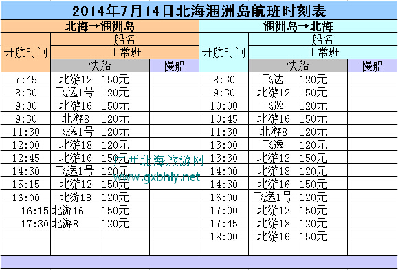 2014年7月14日星期一北海潿洲島航班時(shí)刻表: