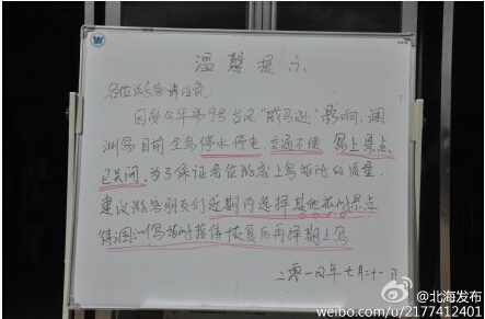 據(jù)了解目前尚未恢復(fù)去潿洲島正?瓦\營運,客運碼頭也貼出溫馨提示游客朋友:受臺風(fēng)影響,目前潿洲島停水停電,交通不便,島上景點已關(guān)閉。建議游客朋友們近期選擇其他景點,待潿洲島做好災(zāi)后重建,恢復(fù)接待能力后再擇期上島。