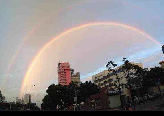 昨天(21日)傍晚,強降雨過程剛剛減弱的空隙,北海市區(qū)天空美景如畫,晚霞和雙彩虹相應(yīng)成趣的在天空舞臺上精彩的“表演”,讓很多路人駐足觀看。諺語有“朝霞不出門,晚霞行千里;東虹日頭,西虹雨”的講法,昨天傍晚北海市出現(xiàn)的是“西邊晚霞,東邊彩虹”景象,當時拍攝地點廣東路還下著點小雨。此次彩虹生命極短,從單虹變雙虹直至消失只持續(xù)了30分鐘左右。
