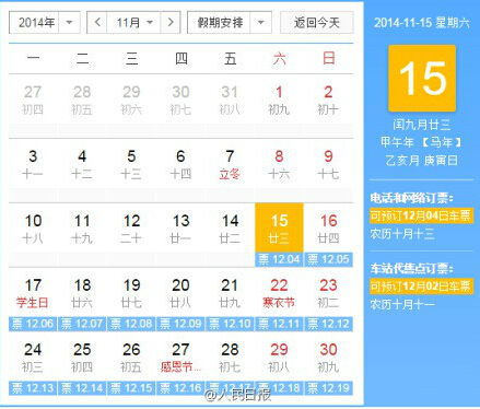 根據(jù)新的預(yù)售期安排,12月7日,旅客就可以購買2015年鐵路春運(yùn)第一天的火車票了。鐵路部門計(jì)劃春運(yùn)結(jié)束后,火車票的預(yù)售期仍保持60天。車站窗口等其他售票方式仍按錯(cuò)后兩天的原則同步執(zhí)行。
