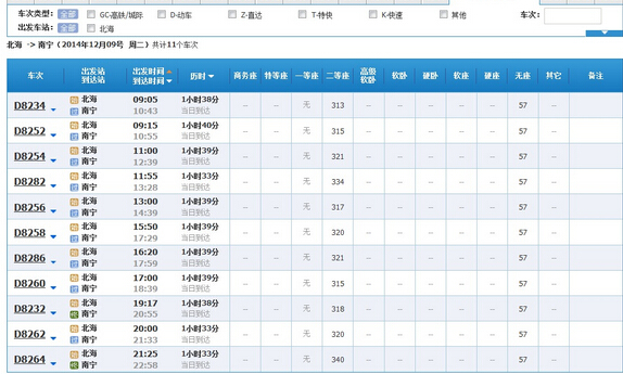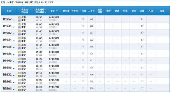 從12月9日和10日的北海到南寧車(chē)次可以看出有如下幾個(gè)區(qū)別: