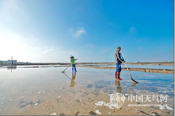 劉叔向通訊員介紹,在日照充足的日子里,鹽場(chǎng)工人將池中海水通過(guò)輸鹵溝引到坡度最低的鹽池,再用水泵抽到初級(jí)、中級(jí)蒸發(fā)池,利用太陽(yáng)的曝曬蒸發(fā),使海水的含鹽量逐步加大。在這個(gè)過(guò)程中,會(huì)析出不同的雜質(zhì)。用波米表測(cè)量,當(dāng)海水含鹽濃度達(dá)到25度時(shí),便將鹵水引入結(jié)晶池。這時(shí)氯化鈉溶液已經(jīng)飽和,再經(jīng)過(guò)日曬,便會(huì)結(jié)晶,析出白花花的粗鹽。他還介紹說(shuō),出鹽周期是不定時(shí)的,跟天氣情況關(guān)系密切。11月中旬以來(lái)的這一段時(shí)期都是晴好天氣,日照和濕度等氣象條件都十分適宜出鹽,出鹽周期比其它天氣都要短一些。