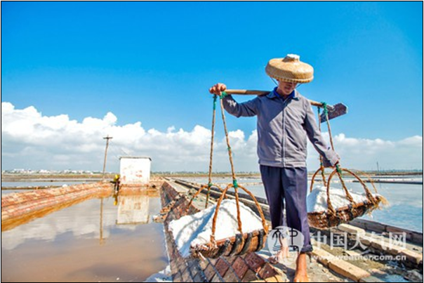 在竹林鹽場(chǎng)一個(gè)個(gè)方形的鹽田里,一男一女兩名工人正在清理池底,在淺淺的海水里,結(jié)晶池露出了由紅磚鋪砌的池底,非常醒目。對(duì)于工區(qū)的鹽工而言,每天的工作從凌晨四點(diǎn)左右開(kāi)始!澳菚r(shí)每天那個(gè)時(shí)候氣溫最低,適合收鹽。”鹽工劉叔解釋道。收鹽,是用木耙把鹽勻到簸箕里,再一擔(dān)一擔(dān)挑到鹽田邊的倉(cāng)庫(kù)里。“每擔(dān)兩百多斤的海鹽,就靠一個(gè)人扛上來(lái),非常辛苦!弊隽20年的劉叔感慨。