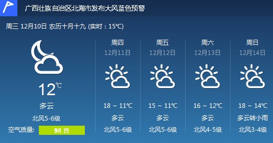 受冷空氣補充影響,北部灣海面:未來兩天,多云,偏北風(fēng)6級,陣風(fēng)7到8級。北海港和潿洲島各臺風(fēng)警報站所掛強風(fēng)信號一號風(fēng)球不改變。北海市氣象臺今天16時發(fā)布大風(fēng)藍(lán)色預(yù)警信號。北海市:未來兩天,多云,偏北風(fēng)5級,陣風(fēng)6級,最低氣溫12度,最高氣溫18度。