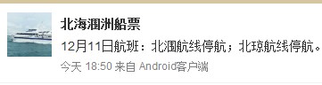 北海船務(wù)公司今天下午發(fā)布停航通知:12月11日航班:北潿航線停航;北瓊航線停航。有出游計劃游客朋友請及時調(diào)整行程。