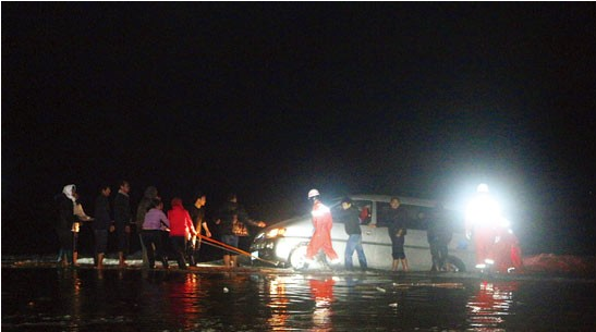 情急之下,謝先生一行人合力推車,但面包車紋絲不動。這時,黑暗中走來七八名當(dāng)?shù)卮迕,稱可幫推車,但要價3000元。謝先生覺得對方要價太高,于是跑到海灘邊的公路攔車找人求助。一輛桂A牌照的越野車司機知情后,開車到海邊用纜線拖車,可纜線扯斷了,面包車還沒脫險。越野車司機見沒辦法幫忙,開車離開了。