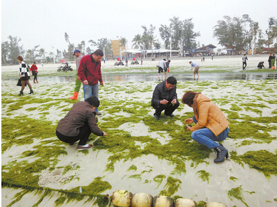 銀灘景區(qū)的工作人員看到記者在觀察,主動(dòng)詢問,需不需要袋子和大家一起撿?工作人員向記者介紹,最近這幾年每年這個(gè)時(shí)候,滸苔被潮水沖到海灘上,便有很多人來這里撿拾海帶,帶回去做菜煲湯。(北海日報(bào))