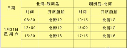 由于還沒風(fēng)浪相對(duì)減弱,船務(wù)公司今天下午宣布明天潿洲島復(fù)航,1月31日航班:北海-潿洲【0830北游12,1200北游12,1530北游16】;潿洲-北海【1015北游12,1500北游12,1715北游16】;北海-?凇1800北1號(hào)】;?-北!1900北2號(hào)】。
