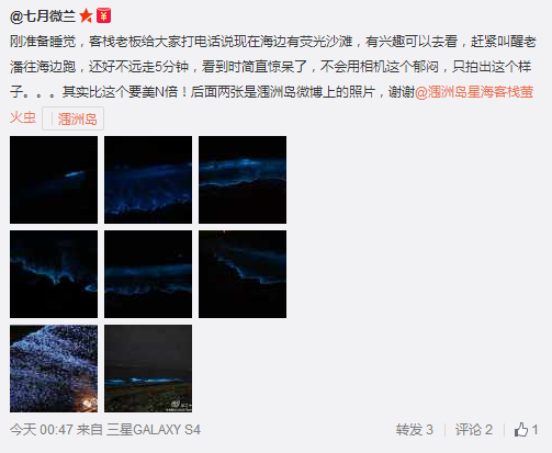 2015年2月13日凌晨,也就是今天,據(jù)島民和游客反映潿洲島牛欄山及貝殼海灘一帶出現(xiàn)奇異的熒光海灘美景,不少游客有幸親身目睹了這一奇妙的景觀。
