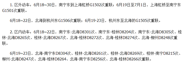 端午節(jié)(6月19-22日)南寧鐵路局將在北海方向增開多趟動車、現有部分動車重聯,具體如下