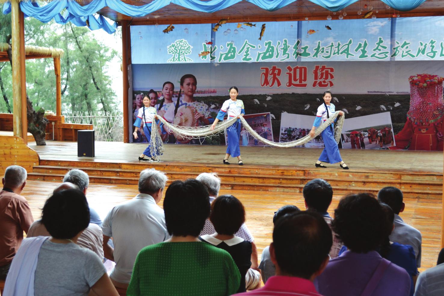 為了讓游客感受到北海本地的疍家文化,在金海灣紅樹林景區(qū)的表演區(qū),每天都有疍家風(fēng)情的節(jié)目上演,主持人解說及演員的精彩表演吸引了眾多游客。