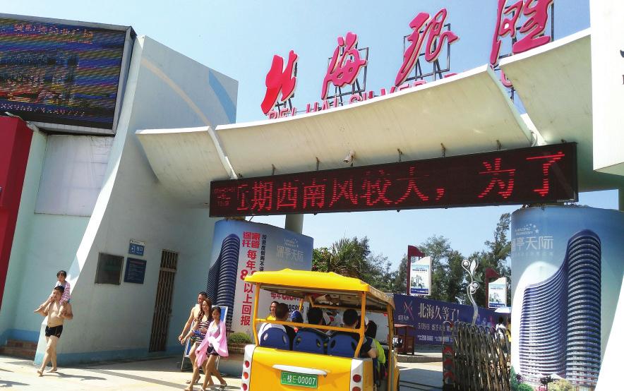 電子LED顯示屏及時(shí)滾動(dòng)播放當(dāng)天天氣及海浪情況,提醒游客注意游泳安全。