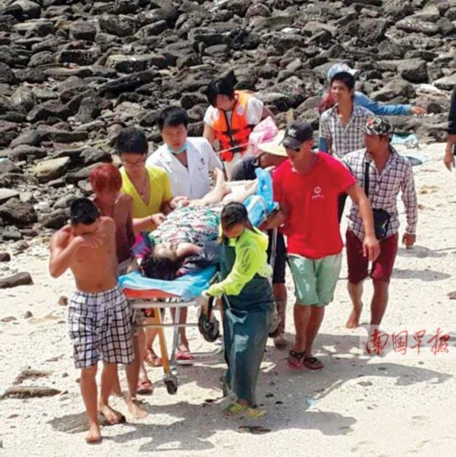 當日上午11時許,駐島民警與潿洲島衛(wèi)生院醫(yī)務(wù)人員趕到現(xiàn)場,但因被礁石撞傷,加上溺水,兩人處于昏迷當中!澳凶拥募绮亢投浚艿阶矒舫鲅,顱底骨折,女子的后腦勺也因受劇烈撞擊,有一道幾公分的傷口。經(jīng)過治療,男子已蘇醒,但情況未明顯好轉(zhuǎn),而女子傷勢較重。考慮潿洲島醫(yī)療條件有限,兩人被緊急送往北海市人民醫(yī)院搶救。