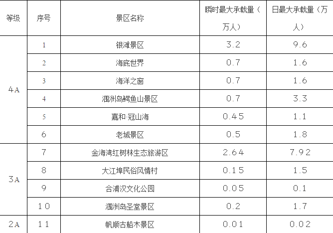 已核定公布最大承載量的各旅游景區(qū)需嚴(yán)格按照《中華人民共和國旅游法》的要求,強化最大承載量管理,依法實施最大承載量控制措施,切實提升景區(qū)旅游安全管理水平,確保游客人身財產(chǎn)安全。北海旅游景區(qū)日最大承載量列表:
